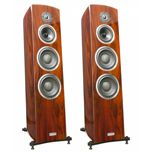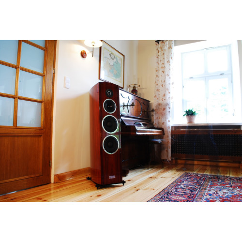 ЯСНИЙ абсолютно чистий, прозорий і природний звук! Дуже жорсткі, безрезонансні корпуси! Майже 112 кг ваги пари. Чудові фасонні корпуси з ідеальними пропорціями. КОЛІР винятковий, блискучий зі справжнім африканським шпоном. СУПЕР глянсовий рояльний лак перетворює колонки на ювелірні вироби у вашому будинку.