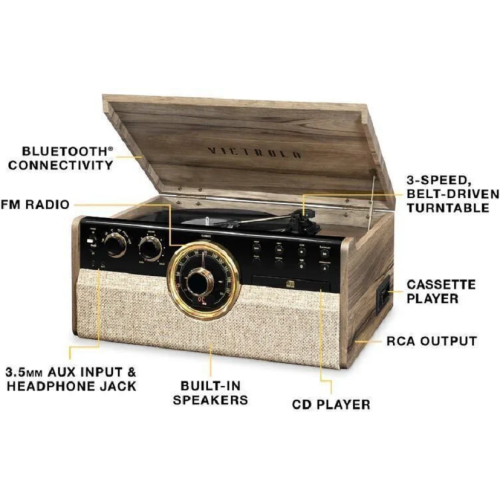 Ретро стиль 50-х років.Victrola Empire 6-в-1: Bluetooth, CD-плеєр, додатковий вхід 3,5 мм, 3-х швидкісний програвач вінілових платівок, касетний плеєр, радіо. Класичне FM-радіо з аналоговим тюнером, світлодіодним підсвічуванням по колу, вбудовані стерео-динаміки.